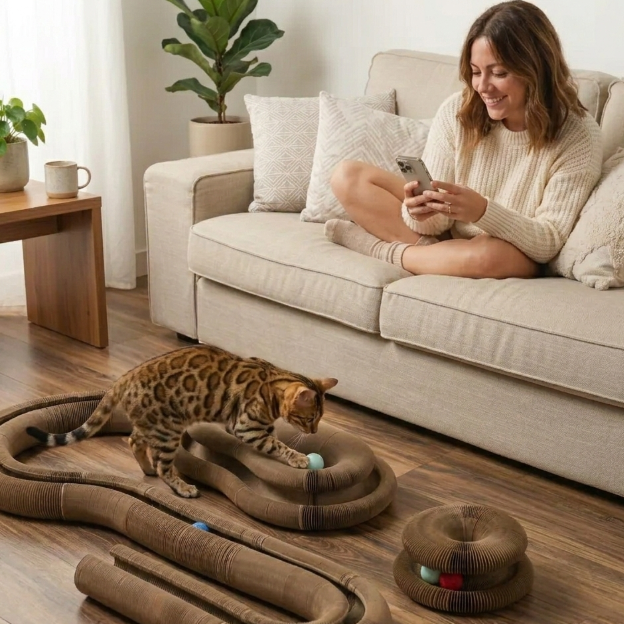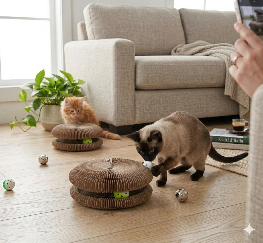 Trasforma graffi sull'arredamento e comportamenti ansiosi in gioco sano, senza sensi di colpa o frustrazione.